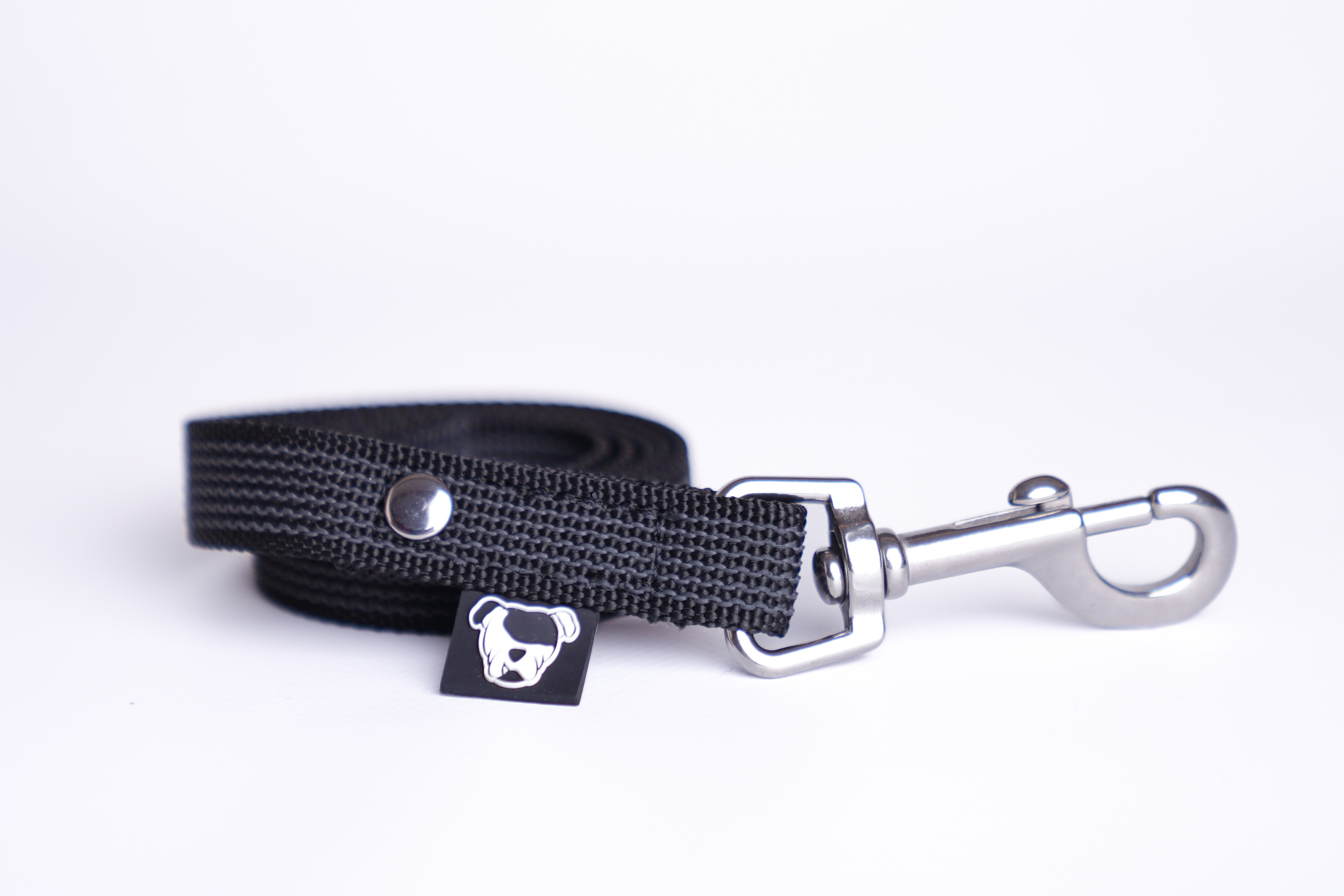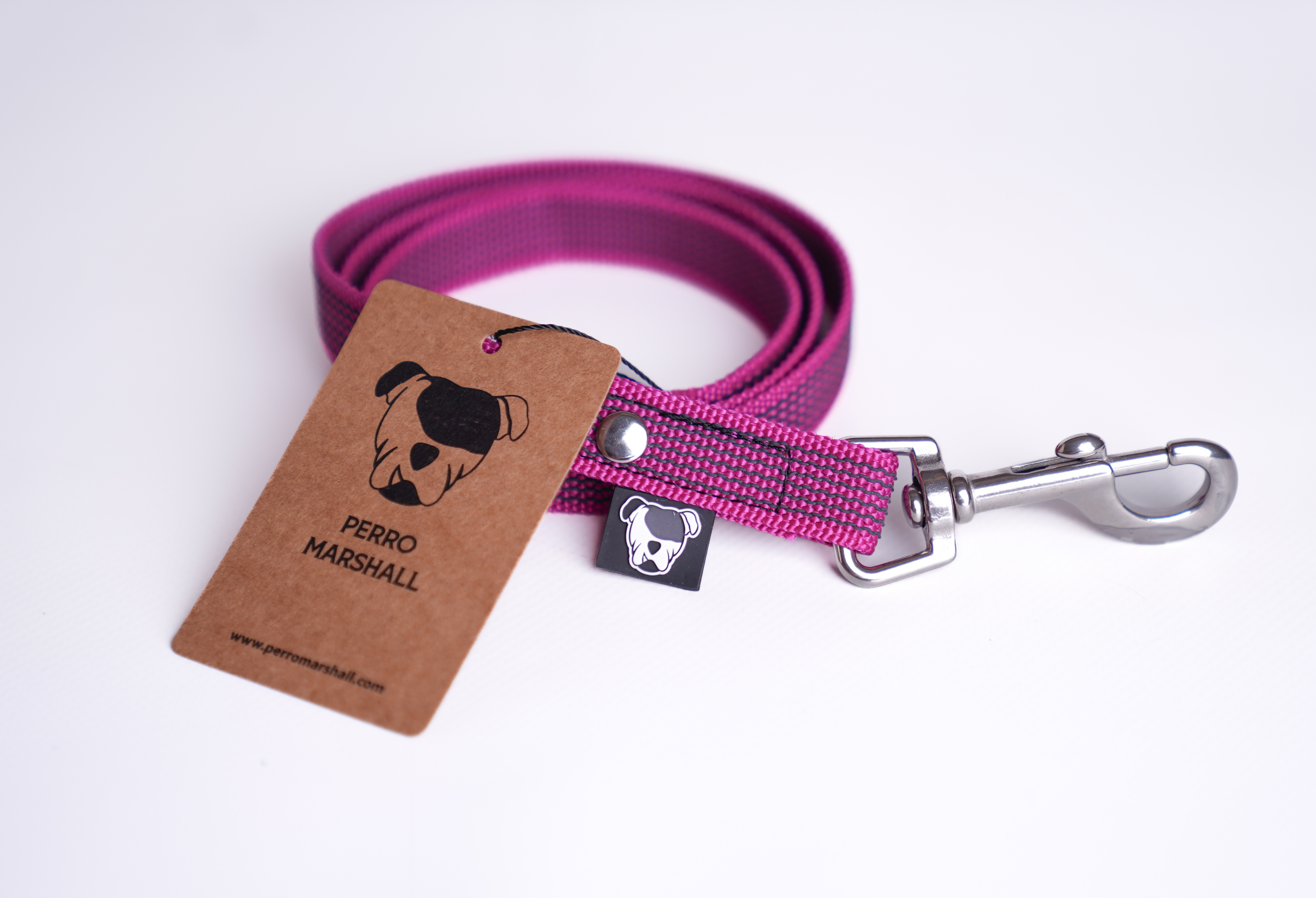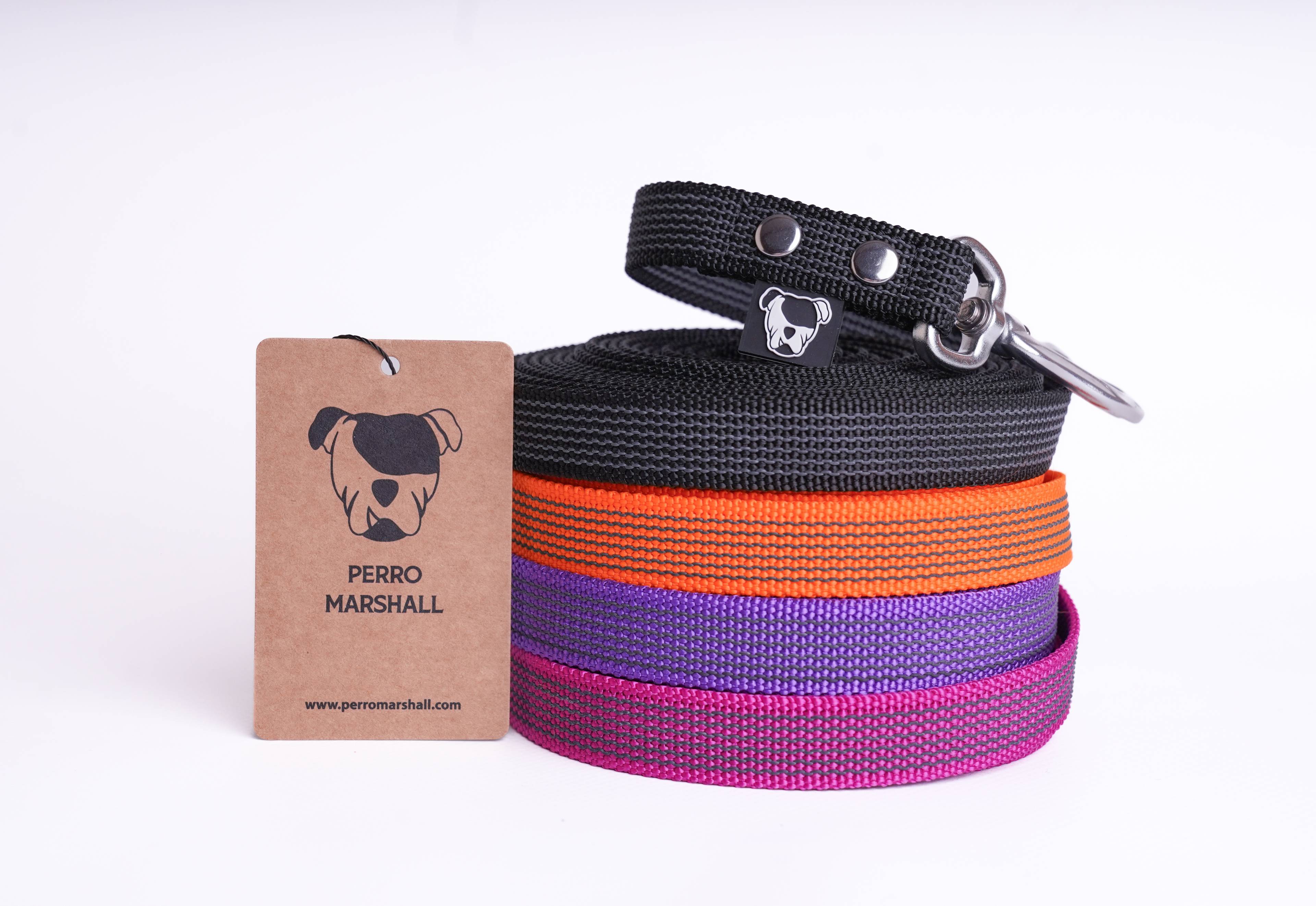 Smycz została wykończona okuciami ze stali nierdzewnej, a przy karabińczyku znajduje się elegancka metka z logo Perro Marshall, symbolizująca solidność i styl.